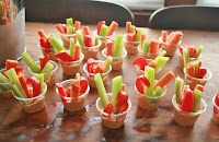 Veggies -- there are a lot of fun ways to dress up veggies so they appeal to your kids more. Here are just a couple of ideas (the picture links to where we found the idea). Veggie cups with hummus at the bottom is a great way to make veggies fun. Another fun option would be veggie kabobs with cherry tomatoes, peppers, cucumbers, etc. Veggie boats are something I have never tried but they look great.